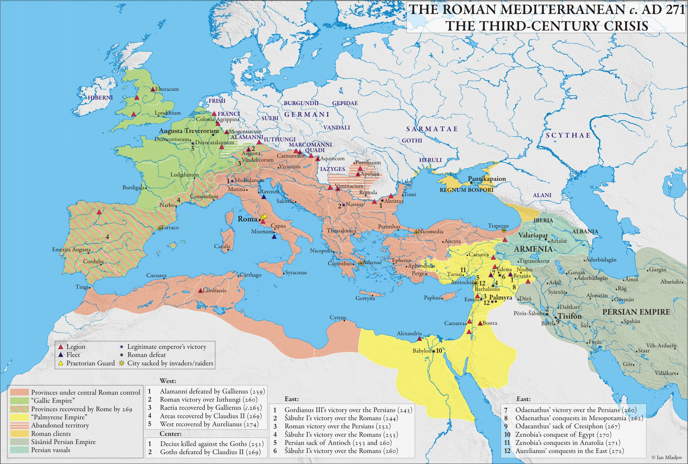 | Χάρτης Ρωμαϊκής Αυτοκρατορίας 3ος αι. μ. Χ. Ο χάρτης απεικονίζει την τριχοτόμηση της αυτοκρατορίας μετά την αυτονόμηση της Γαλατίας και της Παλμύρας Δημιουργός: ΑΓΑΘΟΔΩΡΑ ΦΡΑΓΚΙΑΔΑΚΗ |